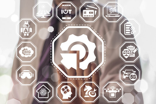 Information Innovative Technology Business Integrate. Man presses cogwheel arrow button on a virtual graphical user interface.