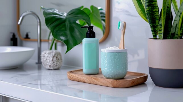 Diverse couple using bathroom mirror in elegantly minimalist setting