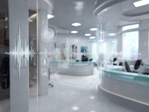 Futuristic medical office interior, overlaid with data visualizations
