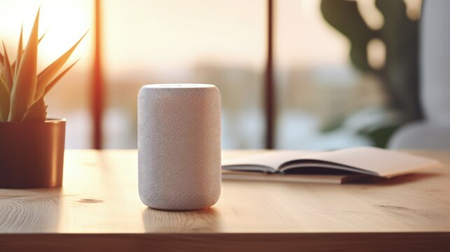 Stylish wireless speaker sits on wooden table. Modern tech device in home. Interior shot shows smart home tech. Portable audio system for music. Device in home office environment. Close-up view of
