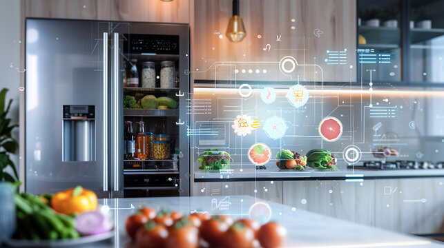 Smart refrigerator with digital interface displaying food information in a modern kitchen setting .