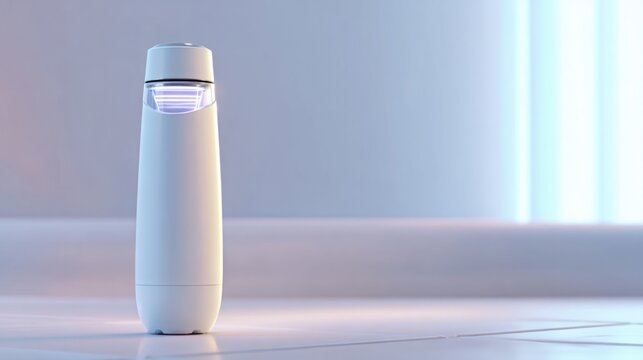 futuristic smart water bottle with glowing hydration level, clean white surface, soft ambient light, minimalist tech wellness
