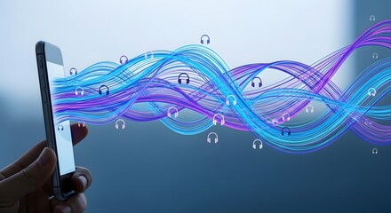 Modern smartphone streaming music with dynamic audio waves and headphones, ideal for music apps and digital content