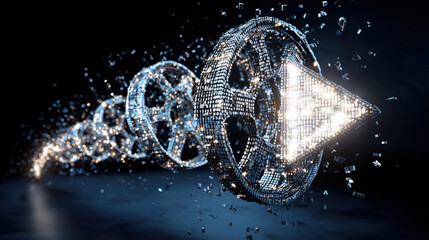 film reel unraveling into streaming play button icon made of pixels creative metaphor illustration concept scene visual for commercial design use high detail quality stock image illustration concept