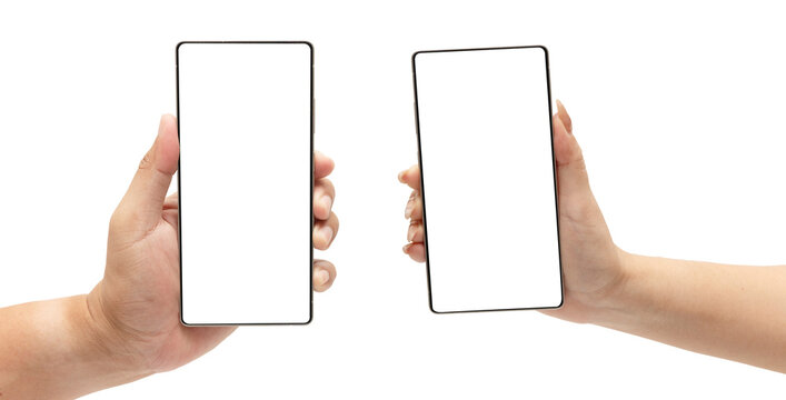 Male and female hands holding smartphones with blank white screens, ideal for comparison, app mockups, or technology presentations