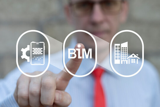 BIM Building Information Modeling Concept. Architecture Construction Build Software Developing Complexity Technology. Business person using virtual touch screen sees abbreviation: BIM.