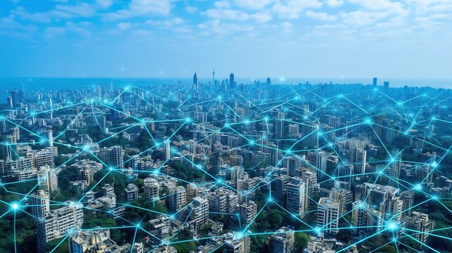 Abstract futuristic smart city concept with glowing digital network connections over blue metropolis skyline, top view of interconnected urban infrastructure with data transfer visualization. Technolo