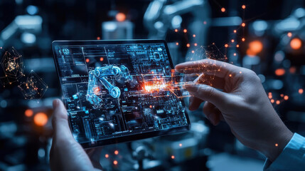 Hands interacting with digital tablet displaying robotic technology and data visualization in smart factory environment, showcasing advanced automation and innovation