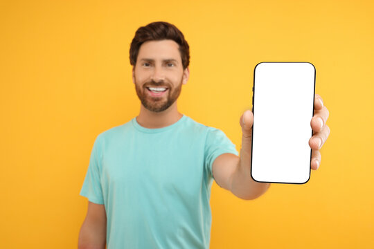 Handsome man showing smartphone in hand on yellow background, selective focus. Mockup for design