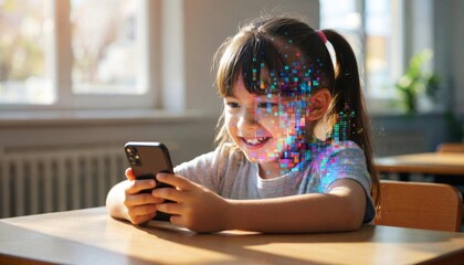 A schoolgirl is sitting at a table by the window with a smartphone in her hands. An abstract digital portrait, the face is layered on a grid of data and pixels.