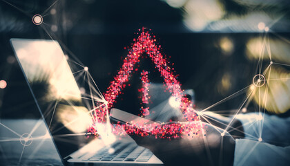 Digital red exclamation mark hologram icon over laptop and smartphone background, representing technology alert concept.
