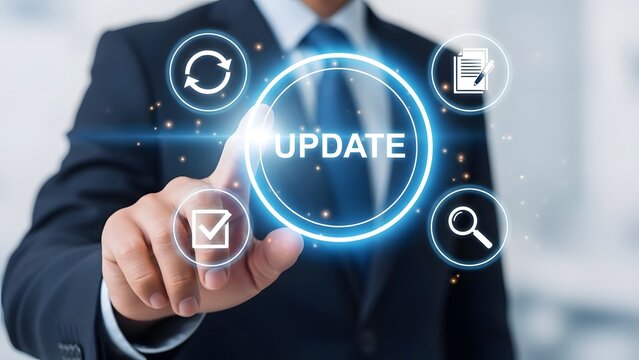 An man presents a smartphone with a blue screen showcasing gears and a loading bar against a blue backdrop, symbolizing technological progress and digital processes.