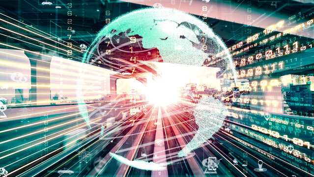 Smart transportation in tacit futuristic city with online traffic control system . Concept of smart digital transformation and technology disruption that changes global trends in new information era .
