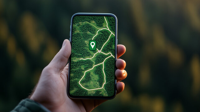 person holding smartphone displaying detailed map of forested area with paths and location marker. image conveys exploration and adventure