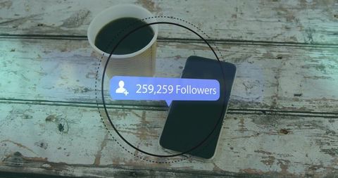 Smartphone with coffee on rustic wood table featuring 259,259 followers notification badge