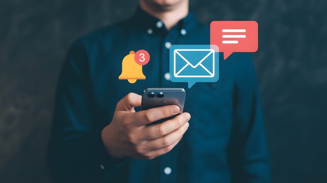 Person using smartphone with notification bubble and bell icon, close-up