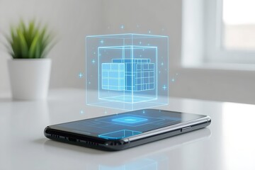 Futuristic smartphone with hologram projection showcasing advanced technology and secure data encryption for modern communication and virtual reality experience