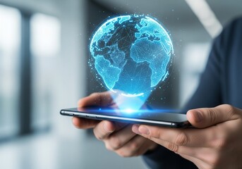 Man holding smartphone displaying a holographic globe projection in bright blue