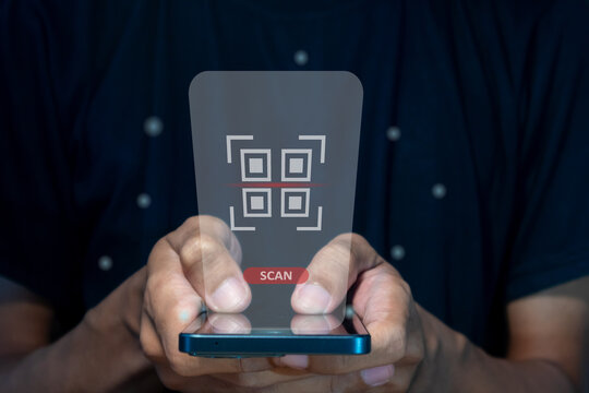 Customers pay via mobile phone and scan QR code to shopping online. The concept of using smartphone to scan QR code to digital banking. The use of technology in daily life of modern people.