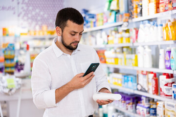 Portrait of focused bearded man choosing cosmetic product at pharmacy, using smartphone for scanning barcode