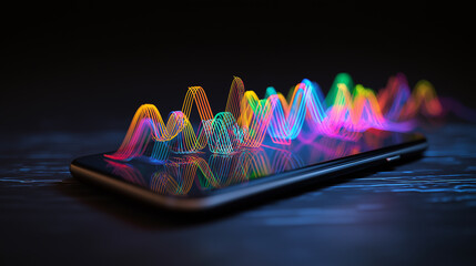 Modern smartphone displaying colorful wave data visualization on screen.