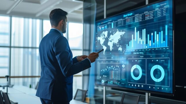 Man in business attire interacting with a futuristic digital interface displaying graphs and data analytics.