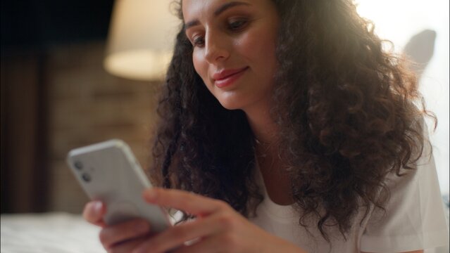 Relaxed woman in cozy bedroom scrolling smartphone indoors