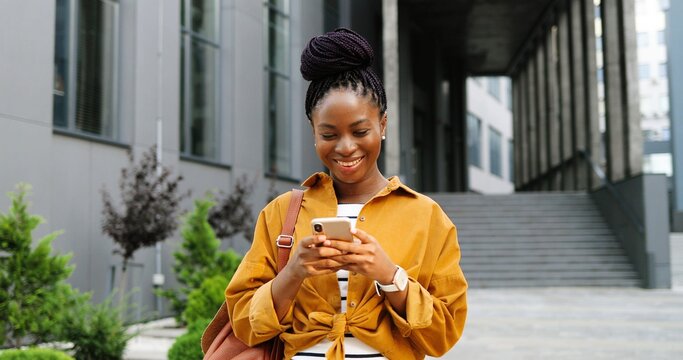 African American joyful young stylish woman tapping or scrolling on smartphone and standing at city street. Beautiful happy female texting message on mobile phone and smiling. Outside.