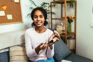 Teenage girl relaxing on couch using smartphone at home