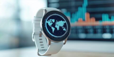 A sleek smartwatch displays a world map against a backdrop of digital graphs, symbolizing technology and global connectivity.