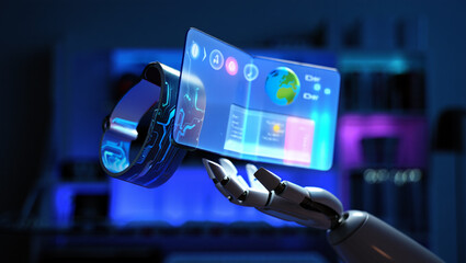 Futuristic smartwatch interface robotic hand displaying data