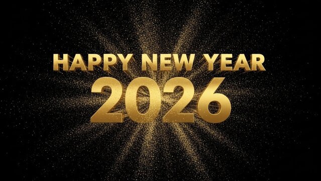 A kinetic typography design the words HAPPY NEW YEAR smash into place to form the 2026, sending out a shockwave of golden particles. Captured at the moment of impact.