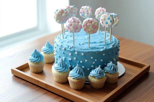 A blue and white smash cake on a wooden tray with baby-themed cupcake toppers