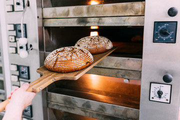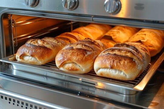 Fresh crusty bread cooling down in the oven after baking on a metal grid