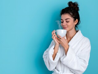 In a morning robe handsome woman  smelling a cup of coffee on a blue background , copy space for text