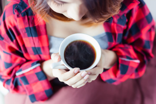 Nice smell and delicious Hot black coffee. Attractive beautiful young woman holding cup of coffee at living room in winter season. Pretty girl drinking hot black coffee no sugar because she want diet