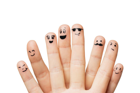 Fingers with smiley faces and a red heart above on a blue background