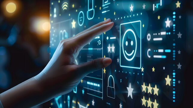 A hand touching a screen with a smiley face and star rating icons