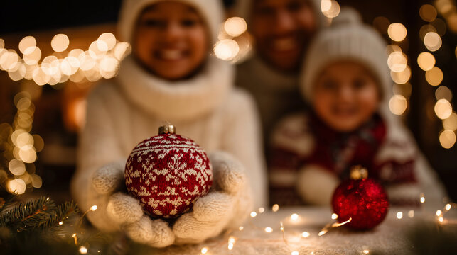 Close-up of family hands holding ornaments over table of decorations, blurred smiling faces in background, warm soft lighting creating inviting Christmas shopping scene