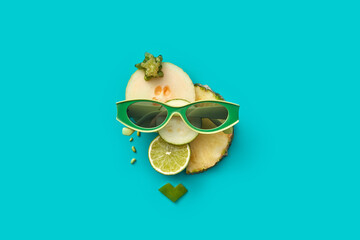 Collage. Smiley in the form of gingerbread in a daisy flower on a blue background. Top view. Copy space.