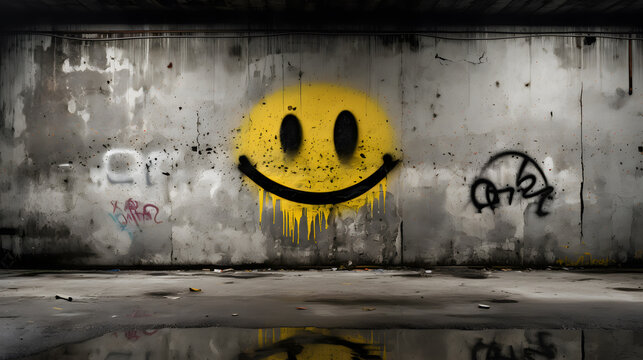 smiley face graffiti sprayed on a wall