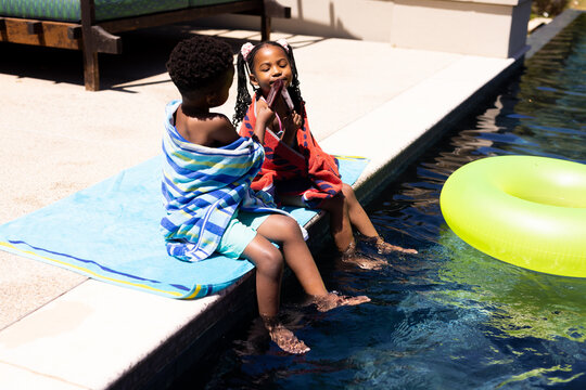 African american boy sharing his ice cream with sister while sitting at poolside at resort in summer