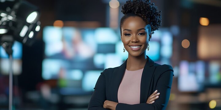 Portrait of a news anchor standing confidently in a broadcast studio, smiling, with copy space