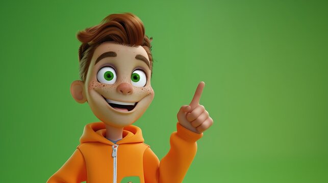 An animated character pointing to a branded logo with enthusiasm on a green background.