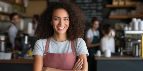 A young barista smiles warmly while serving customers in a cozy café setting during the morning hours.