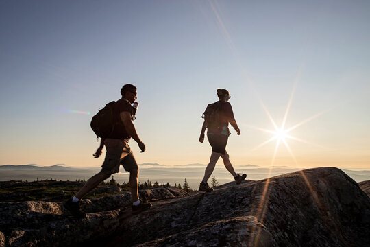 Two hikers reach summit of mountain in Maine at sunrise