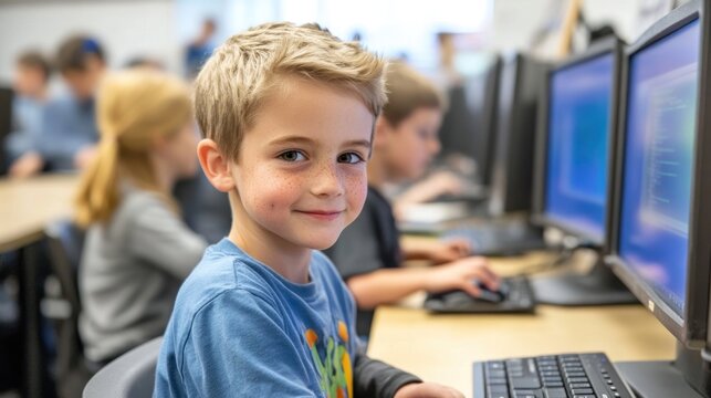 Young boy with bright eyes and light brown hair sitting at classroom desk with blurred colorful background in a back to school setting