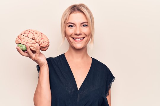 Young beautiful blonde woman asking for care memory holding brain over white background looking positive and happy standing and smiling with a confident smile showing teeth
