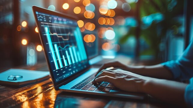 Close-up of a businessman using a notebook computer in a modern office with financial signs and growth graph symbols overlay