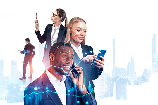 Phone, hologram or man on trading dashboard with a happy smile for financial investments or stocks online. Future overlay or trader with digital ui or ux on financial app for profit growth at night